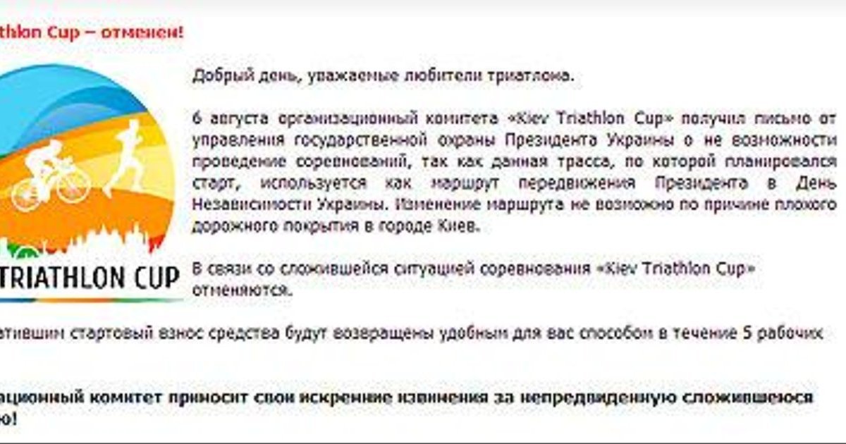 По словам организаторов, 6 августа организационный комитета "Kiev Triathlon Cup" получил письмо от управления государственной охраны президента о не возможности проведения соревнований, "так как данная трасса, по которой планировался старт, используется как маршрут передвижения президента в День Независимости Украины".