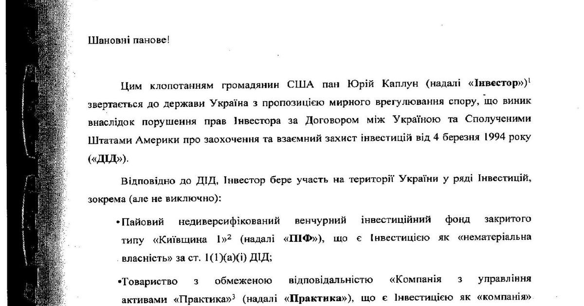 Обманутые американские инвесторы обратились в Кабинет Министров Украины с ходатайством о мирном урегулировании спора, в рамках Договора между Украиной и США о поощрении и взаимной защите инвестиций. В документе подчеркивается, что действиями государственных органов Украины, включая суды и Национальный банк Украины, инвестициям инвесторов причинен имущественный ущерб.