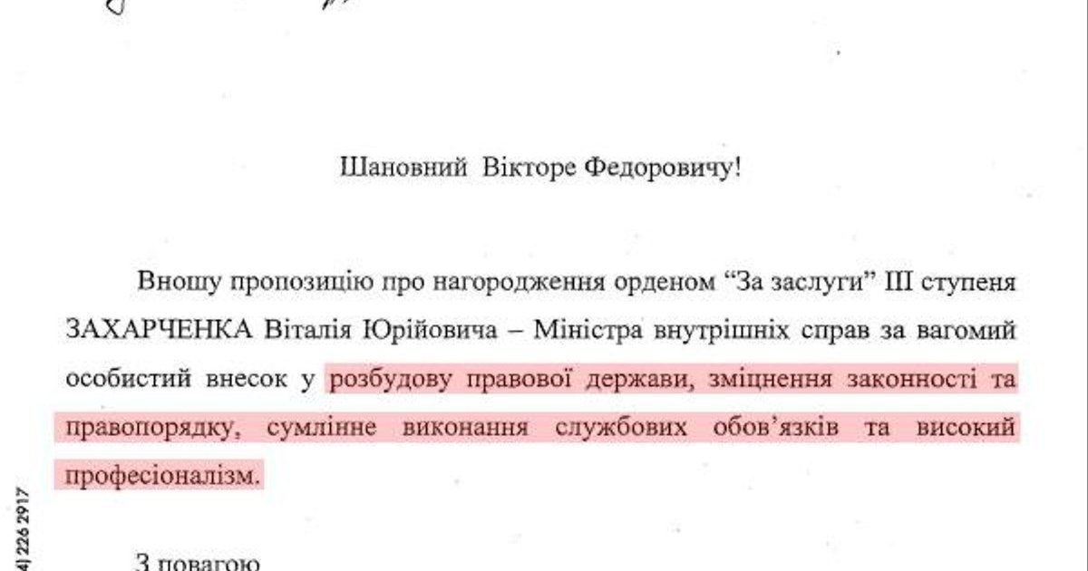 Азаров написал, что Захарченко сделал неоценимый вклад в "развитие правового государства, укрепление законности и правопорядка, добросовестное выполнения служебных обязанностей". Кроме того, министр внутренних дел, оказывается, является носителем "высокого профессионализма ".