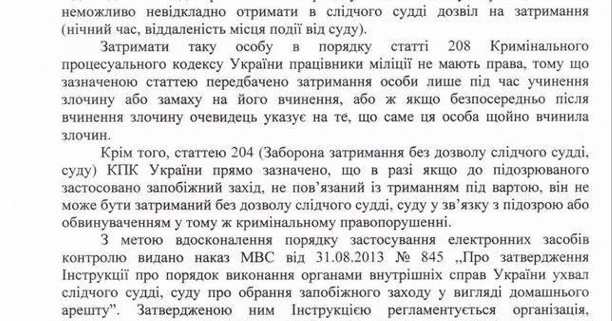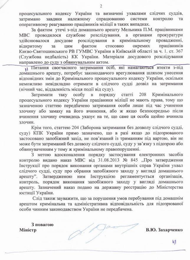 "Следует также отметить, что за нарушение условий пребывания под домашним арестом уголовная и административная ответственность для подозреваемых лиц действующим законодательством не предусмотрена", - пишет также министр Захарченко в своем ответе Москалю.