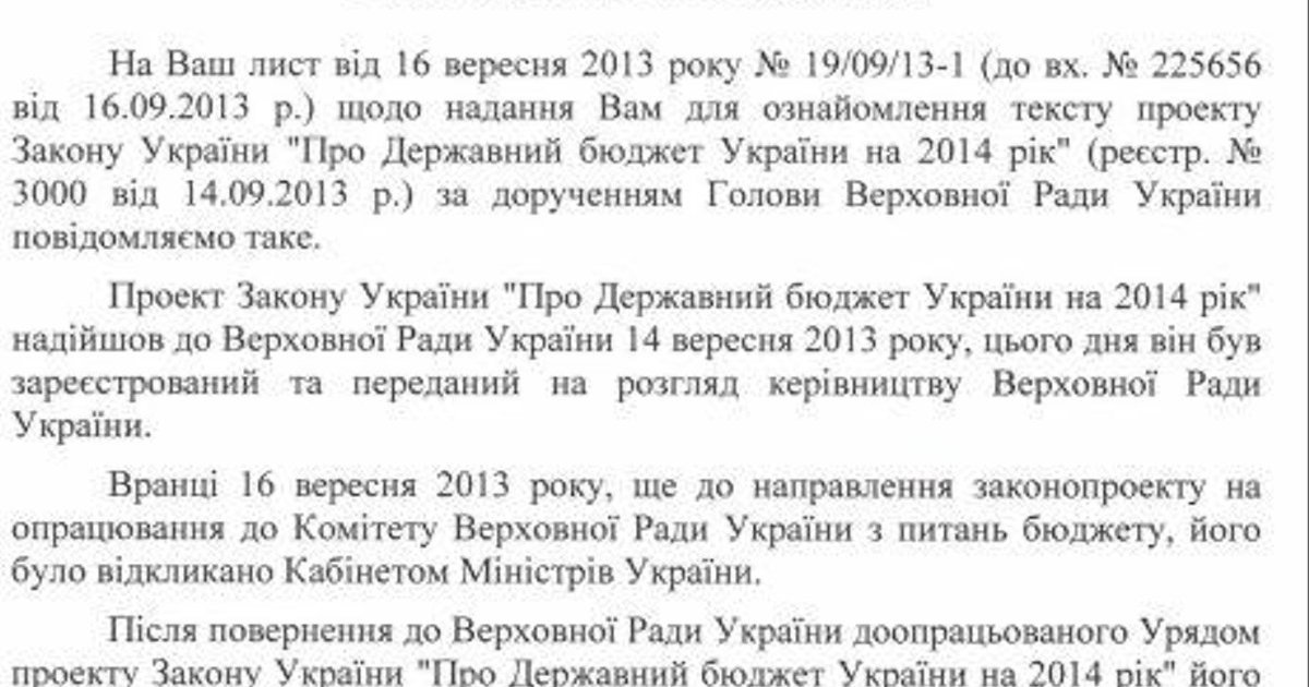 В ответе аппарата говорится, что проект Госбюджета-2014, действительно, поступал в Верховную Раду 14 сентября, но "утром 16 сентября 2013 года, еще до направления законопроекта в комитет Верховной Рады по вопросам бюджета, он был отозван Кабинетом Министров".