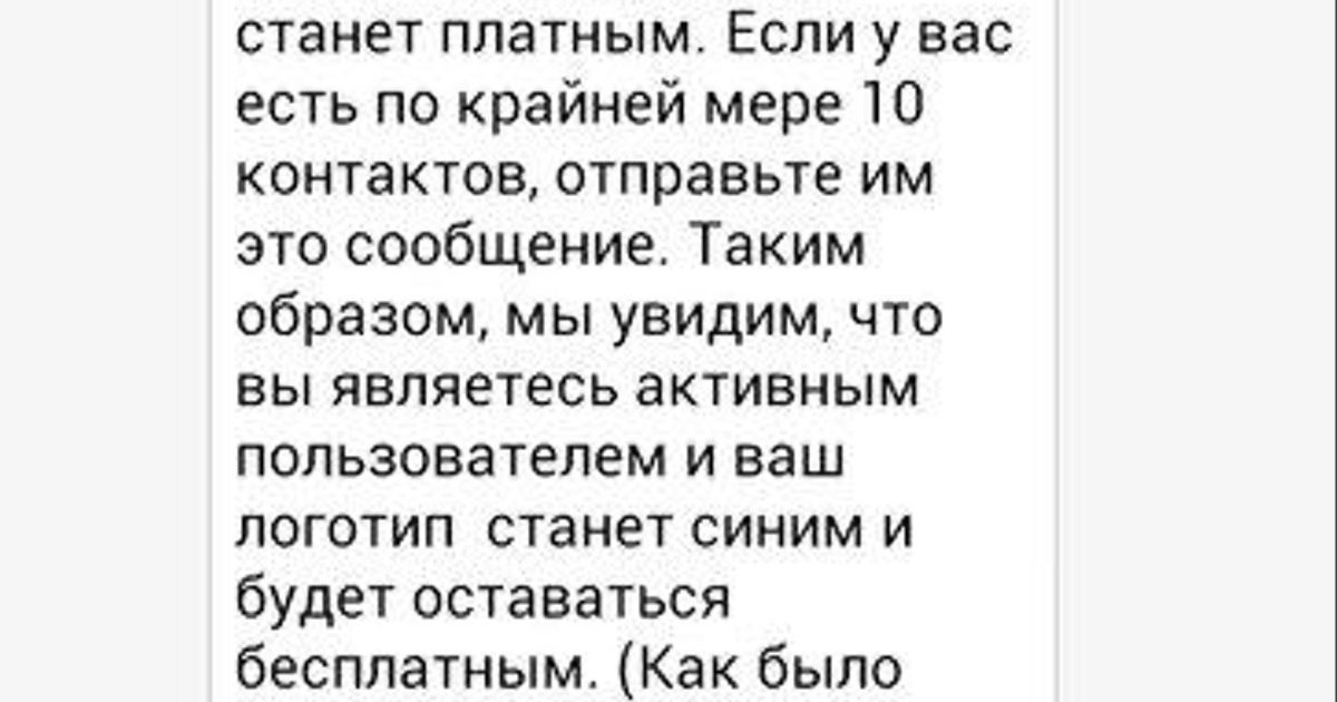 Некоторые пользователи популярного мессенджера WhatsApp в течение недели получали сообщения о том, что в ближайшую субботу сервис станет платным. Руководство WhatsApp уже опровергло слух об этом. В среду аналогичные сообщения начали приходить пользователям мессенджера Viber, информирует Цензор НЕТ со ссылкой на it.tut.by.