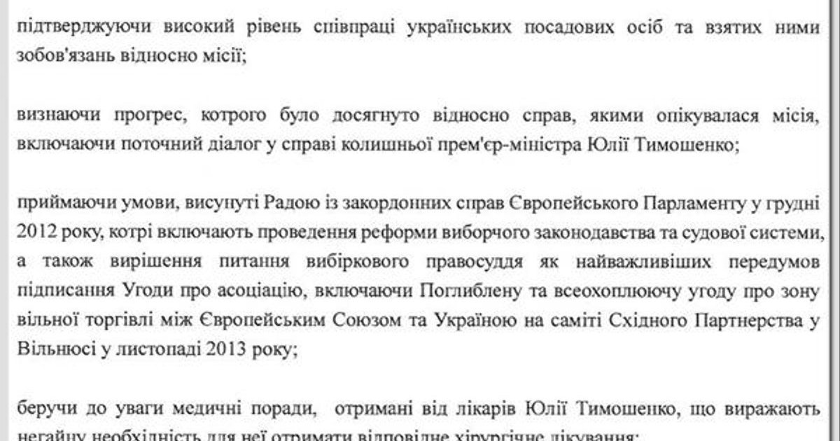К документу также прилагается письмо Кокса и Квасьневского к президенту Виктору Януковичу, в котором они попросили помиловать Юлию Тимошенко «на медицинских и гуманитарных основаниях».
