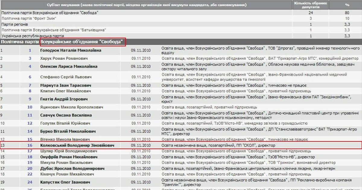 Владимир Колковский, который является депутатом-мажоритарщиком, победив на выборах, вступил во фракцию ВО "Свобода", но он никогда не был и не является членом партии "Свобода".