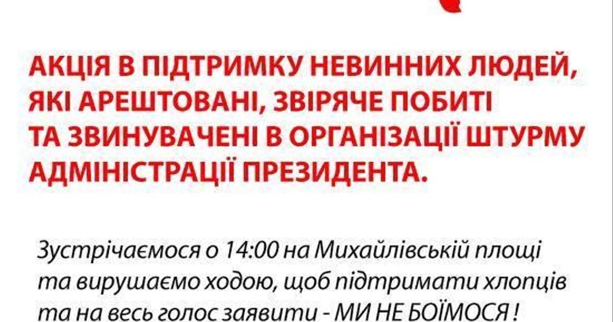 "Акция в поддержку невинных людей, которые арестованы, зверски избиты и обвинены в организации штурма Администрации Президента", - говорится в сообщении.