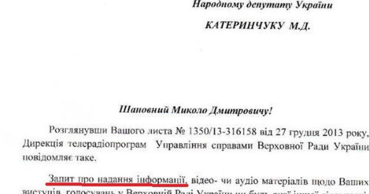 Дирекция телерадиопрограмм Верховной Рады подтвердила, что Главное следственное управление СБУ затребовало от них записи парламентских выступлений Катеринчука за 2013 г. Такой ответ лидер Европейской партии получил на запрос, который направил еще 27 декабря 2013 г.