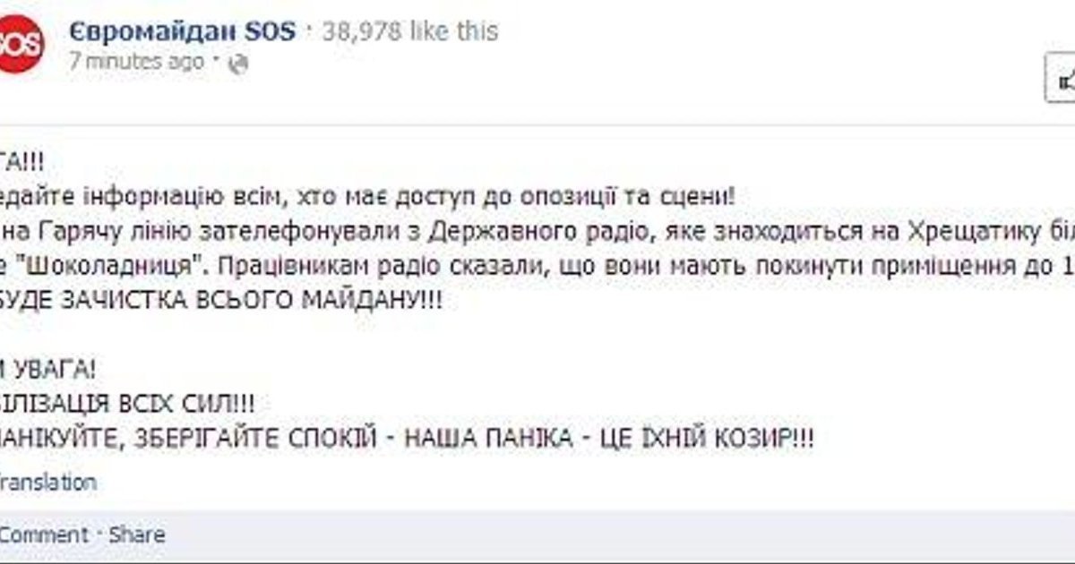 Евромайдану-SOS" сообщили, что работникам Государственного радио, которое находится на Крещатике, приказали покинуть помещение, поскольку вечером будет "зачистка Майдана". Об этом сообщает Цензор НЕТ со ссылкой на сообщение сообщества в социальной сети Фейсбук.
