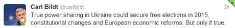 "Правдивое разделение власти в Украине может обеспечить свободные выборы в 2015 году, конституционные изменения и европейские экономические реформы. Но только правдивое", - отметил Бильдт в своем Твиттере.