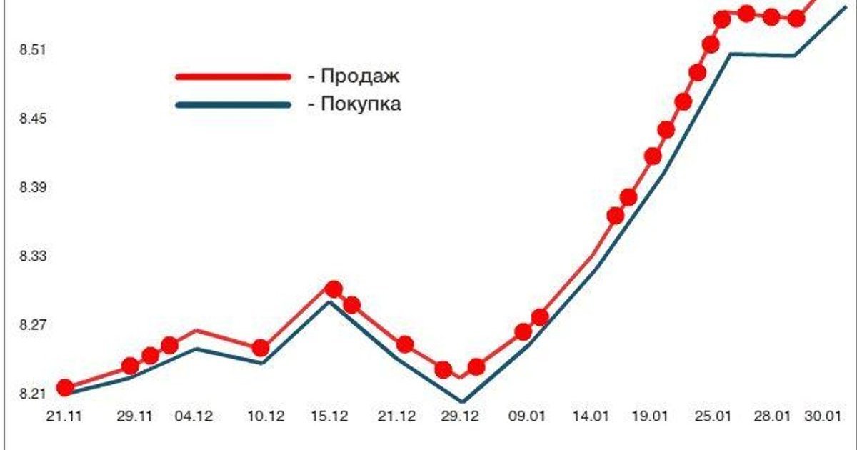 Сдержать рост доллара пытался НБУ с помощью интервенций на межбанке. И пока ему удалось это один раз - 28 января доллар опустился до 8,5 гривен. Однако уже 30 января котировки поползли вверх до 8,64 гривен за доллар. Доллар достиг самого высокого показателя с сентября 2009 - го. Рост за день - 14 копеек.