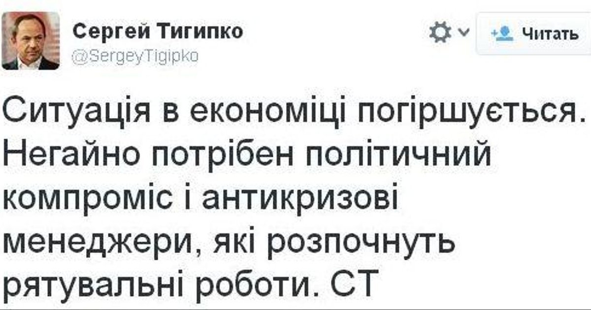 Об этом в совеем Twitter написал народный депутат от Партии регионов Сергей Тигипко, передает Цензор.НЕТ.