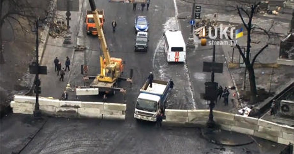 На улице Грушевского, где ночью убрали остатки баррикад протестующих, днем строят стену из железобетонных плит.