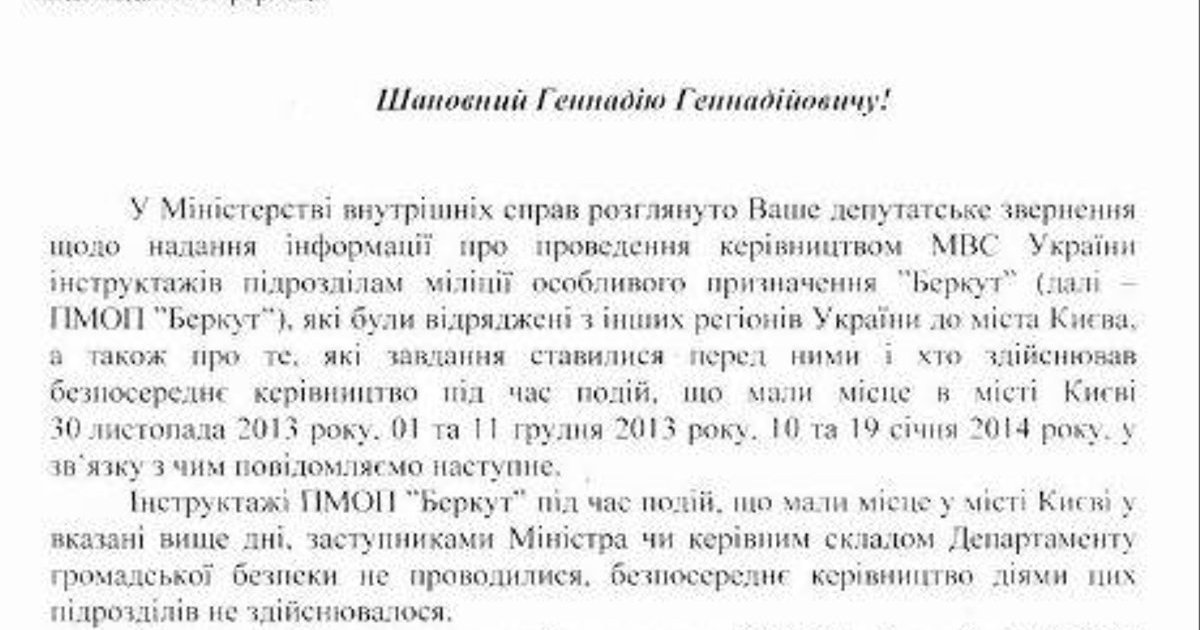 "Инструктаж "Беркута "во время событий... заместителями Министра или руководящим составом Департамента общественной безопасности не проводился, непосредственное руководство действиями подразделений не осуществлялось", - заявил и. о. министра.