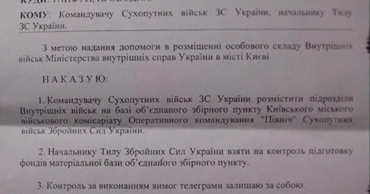 Так, в телеграмме, отправленной командующему сухопутных войск ВС Украины и начальнику Тыла ВС Украины, речь идет о "размещении подразделений Внутренних войск на базе объединенного сборного пункта Киевского городского комиссариата Оперативного командования Север Сухопутных войск Вооруженных Сил Украины". Приказ датирован 12 декабря 2013-го года.