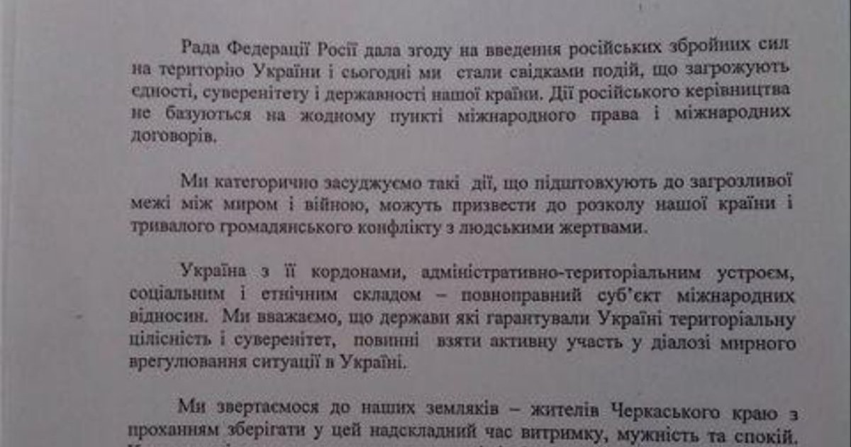 Депутаты Черкасского областного совета обращаются в Верховную Раду Украины и в. о. Президента Украины, а также в Совет Крыма относительно ситуации, которая сложилась вокруг автономной республики Крым.
