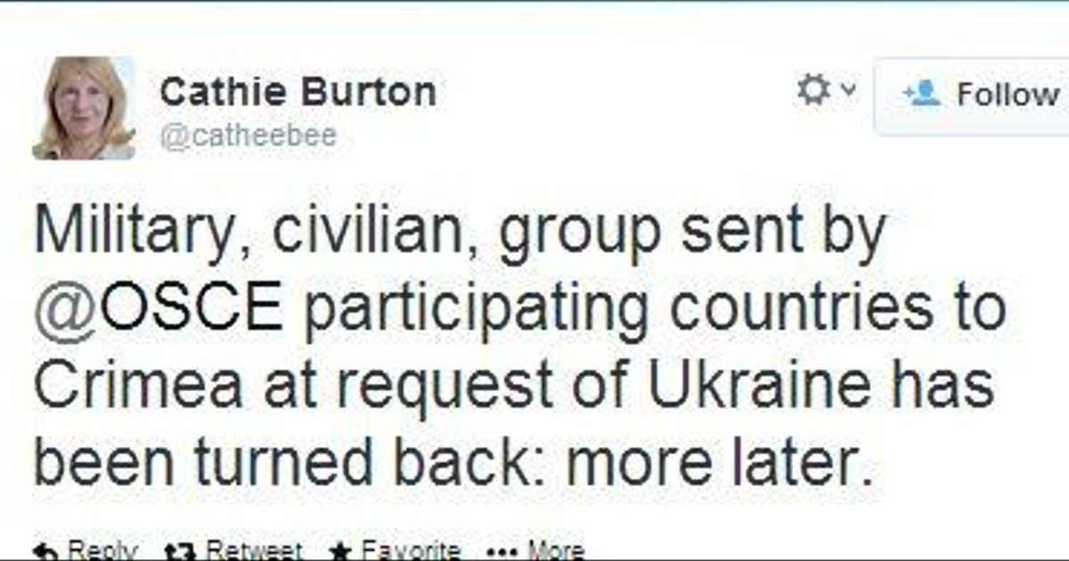 Об этом же в своем Twitter`е сообщила спикер ОБСЕ Кэти Бертон. "Военная и гражданская группа, посланная странами ОБСЕ в Украину, возвращается из Крыма", - написала Бертон.