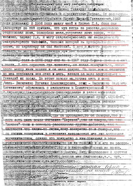 «В 1981 году вышла замуж за Кернес Геннадия Адольфовича, 1959 года рождения, проживала я с родителями Кернес. От совместного брака у меня имеется ребенок Кернес Кирилл Геннадиевич, 1982 года рождения. В 1984 году брак между мной и Кернес был расторгнут по той причине, что муж нигде не работал, постоянно отсутствовал дома, оскорблял меня, устраивал дома ссоры, избивал. Кернес Г.А. я могу охарактеризовать как несдержанного бескультурного человека, человек, который не придерживается своего слова, по характеру – жестокий. После развода муж мне алименты на ребенка не платил, но все же приходил к ребенку. В настоящее время я точно не помню – то ли в 1986, то ли в 1987 году – Кернес пришел к нам в гости. Я его спросила, где алименты, он начал возмущаться, после этого между нами возник скандал и он меня ударил. Но в это время ко мне подбежали мои отец и мать, начали за меня заступаться. Геннадий их побил. По этому поводу мы, точнее, мать и отец, обращались с заявлением в Коминтерновский суд г. Харькова…»