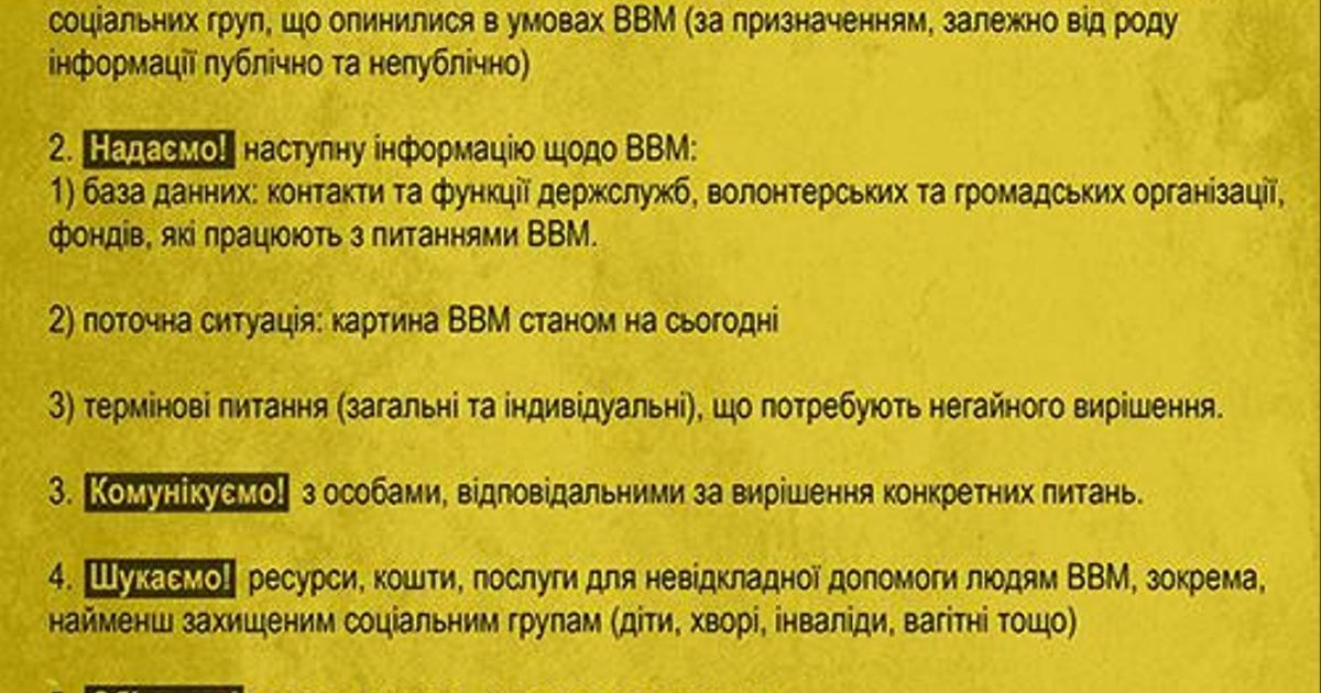 "ВВМ - Вынужденная Внутренняя Миграция. Это моя собственная аббревиатура для обозначения процесса, который имеет место в результате оккупации и войны против Украины. ЦЕнтр ВВМ - это помощь людям, которые покидают зону, оккупированную террористами, которые развязали войну против Украины, помощь людям, которые хотят Мира и Спокойствия. Мы оперативно выясняем важнейшие проблемы ВВМ. Украина никогда не бросит своих в беде!
