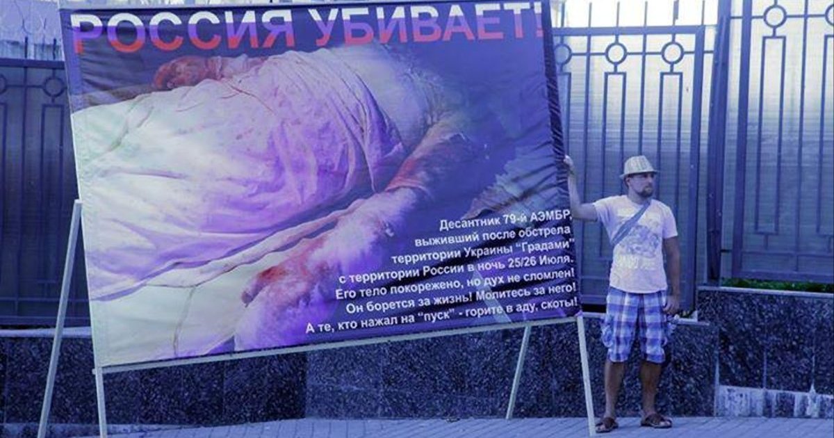 Большой плакат "Россия убивает!" встречает работников российского консульства в Одессе.