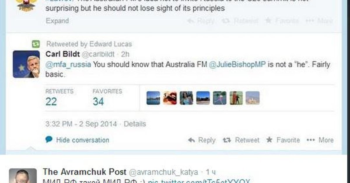 Министр иностранных дел Швеции Карл Бильд в своем Twitter указал на очень низкий уровень знания английского языка МИД Российской Федерации.