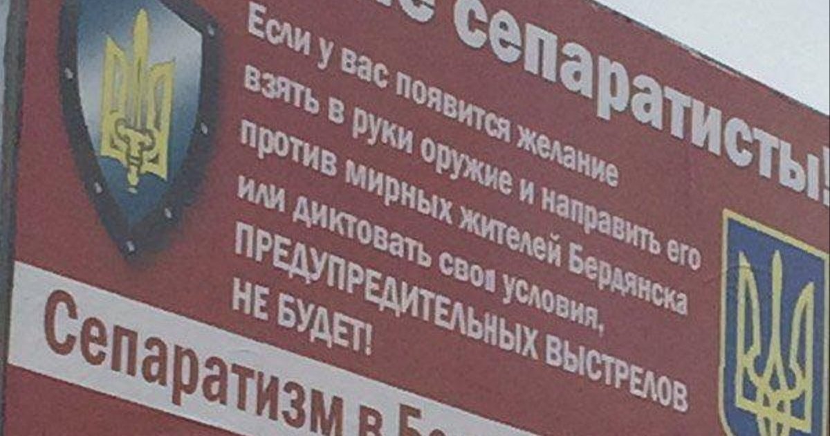 На въезде в город Бердянск Запорожской области появился бигборд, предупреждающих сепаратистов, что "предупредительных выстрелов не будет".