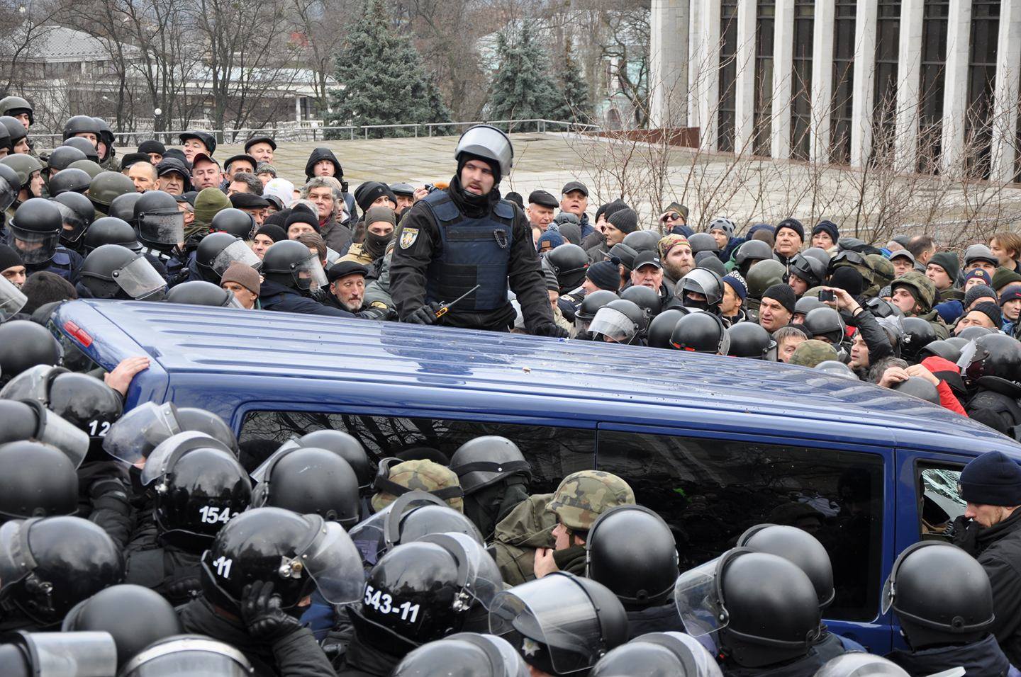 Полиция Киева задерживала 9 человек, которые ранее сегодня в центре Киева блокировали микроавтобус правоохранителей, на котором пытались увезти задержанного экс-главу Одесской ОГА, лидера "Руха новых сил" Михеила Саакашвили.
