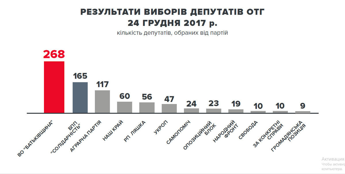 Всего на выборах в ОТГ, которые состоялись 24 декабря, выбирали 1071 депутата, 80% из них выдвигались партиями.