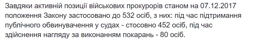 "Благодаря активной позиции военных прокуроров по состоянию на 07.12.2017 положение закона применено к 532 лицам, из них: во время поддержания публичного обвинения в судах - в отношении 452 лиц, при осуществлении надзора за исполнением наказаний - 80 человек", - сообщил Лысенко.