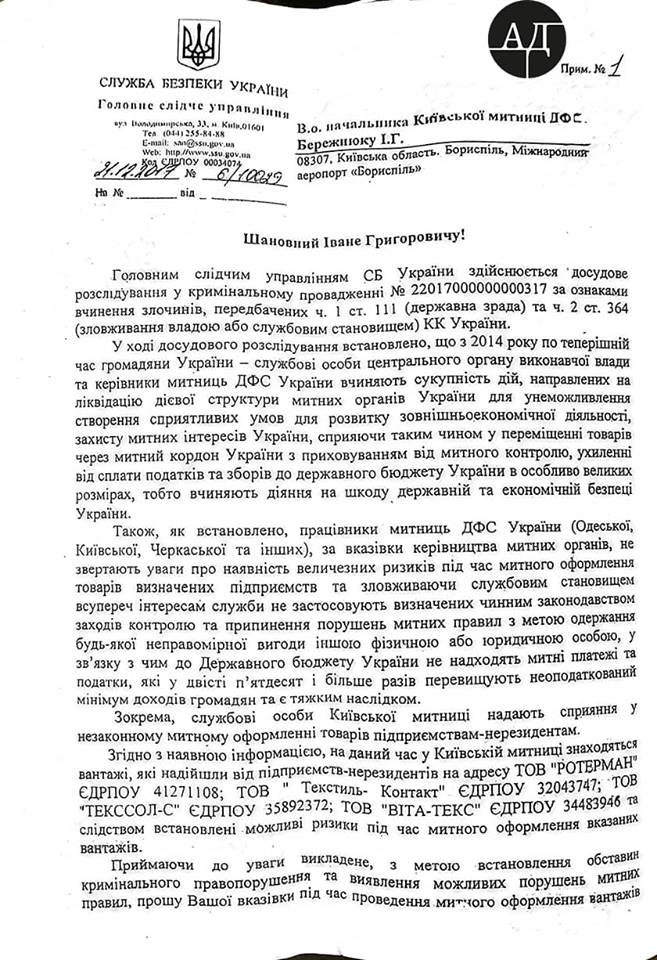 В описании сути дела следователи в общих чертах поясняют, что с 2014 по сегодняшний день некие должностные лица исполнительной власти и руководители различных структурных подразделений таможни ГФС целенаправленно уничтожают как сами таможенные органы Украины, так и способствуют незаконному перемещению грузов через границу Украины... Но, несмотря на такое размытое, хотя красивое вступление, начальник 1 управления ГСУ СБУ Полковник Сичевский, подписавший данное письмо, не приводит в нем ни перечень "сотрудников таможни и должностных лиц исполнительной власти" подозреваемых в государственной измене, ни собственно конкретных примеров данных действий и мер по их противодействию.