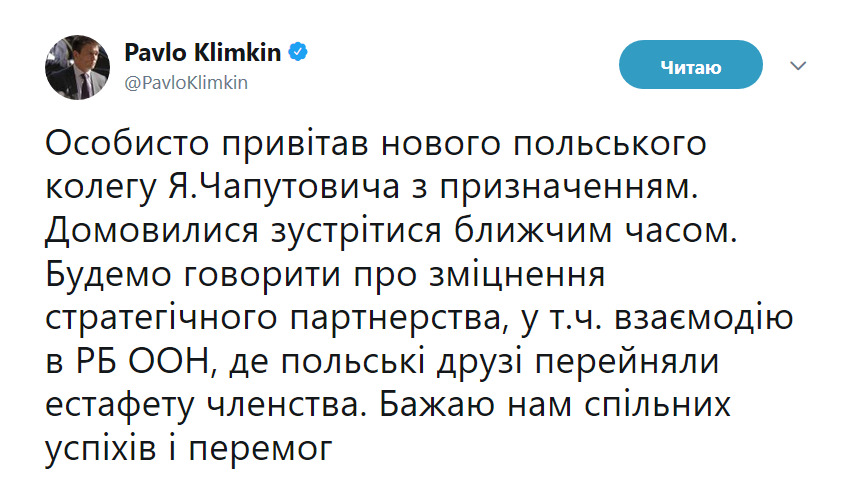 "Лично поздравил нового польского коллегу Я.Чапутовича с назначением. Договорились встретиться в ближайшее время. Будем говорить об укреплении стратегического партнерства, в т.ч. взаимодействии в СБ ООН, где польские друзья переняли эстафету членства. Желаю нам совместных успехов и побед", - написал глава МИД.