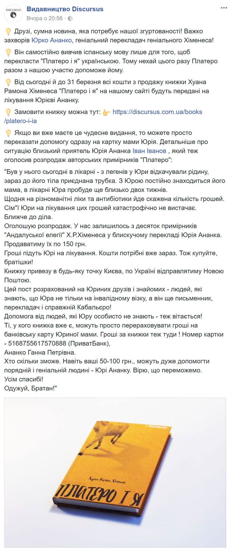 С сегодняшнего дня и до 31 марта все средства с продажи книги Хуана Рамона Хименеса "Платеро и я" на сайте издательства Discursus будут переданы на лечение Юрию Ананко. Заказать книгу можно здесь.