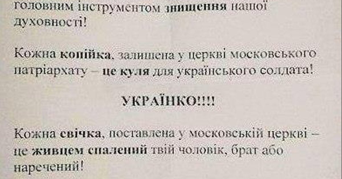 Это "примитивные фальшивки, целью которых является разжигание межконфессиональной розни, дестабилизация и провоцирование социальной напряженности в обществе", заявляет пресс-центр СБУ, публикуя образец такой листовки с призывом к силовым действиям.