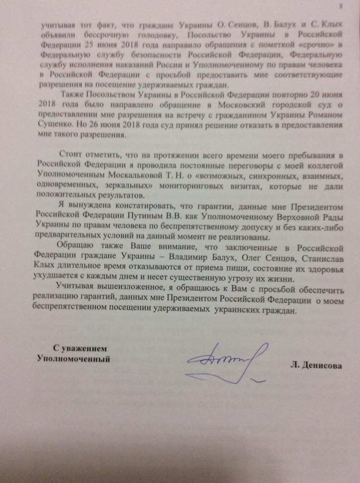 Гарантии, предоставленные мне Путиным по посещению украинских политзаключенных, не выполняются, - Денисова. ДОКУМЕНТ