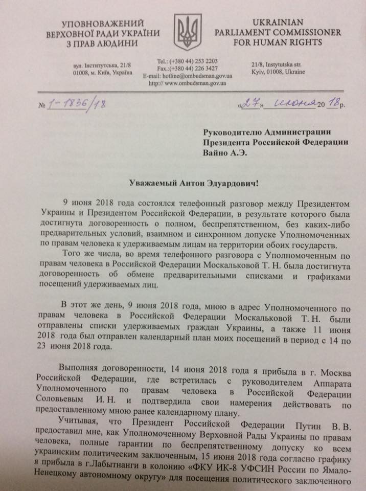 В своём официальном письме я обращаю внимание господина Пескова, что переговоры с Уполномоченным РФ Татьяной Москальковой не дали никаких результатов. И прошу его проинформировать Президента РФ о том, что данные мне как Уполномоченному Верховной Рады Украины по правам человека гарантии про безусловный и беспрепятственный допуск к удерживаемым гражданам Украины на сегодняшний день не выполняются".