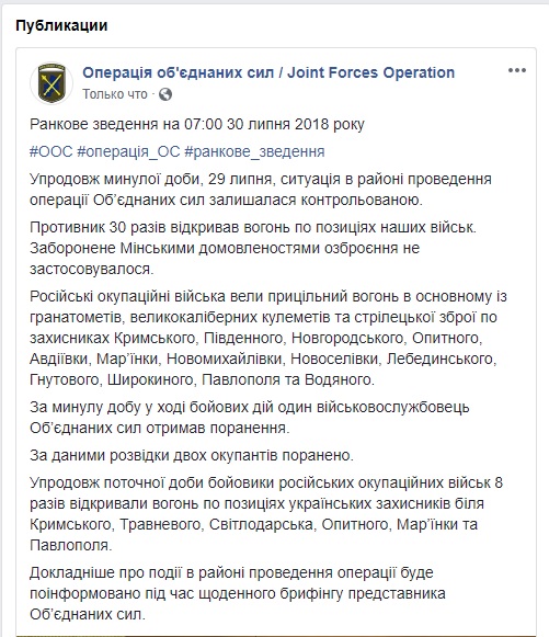 За минувшие сутки в ходе боевых действий один военнослужащий Объединенных сил получил ранения", - сказано в сообщении.