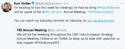 Специальный представитель США по вопросам Украины Курт Волкер приедет в Украину, чтобы провести несколько переговоров и выступить на встрече "Ялтинской европейской стратегии".