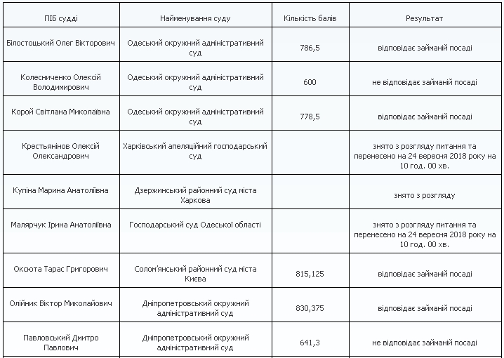 Как сообщает Цензор.НЕТ со ссылкой на сайт ВККСУ, 16 судей признаны соответствующими занимаемой должности, и два - несоответствующими.