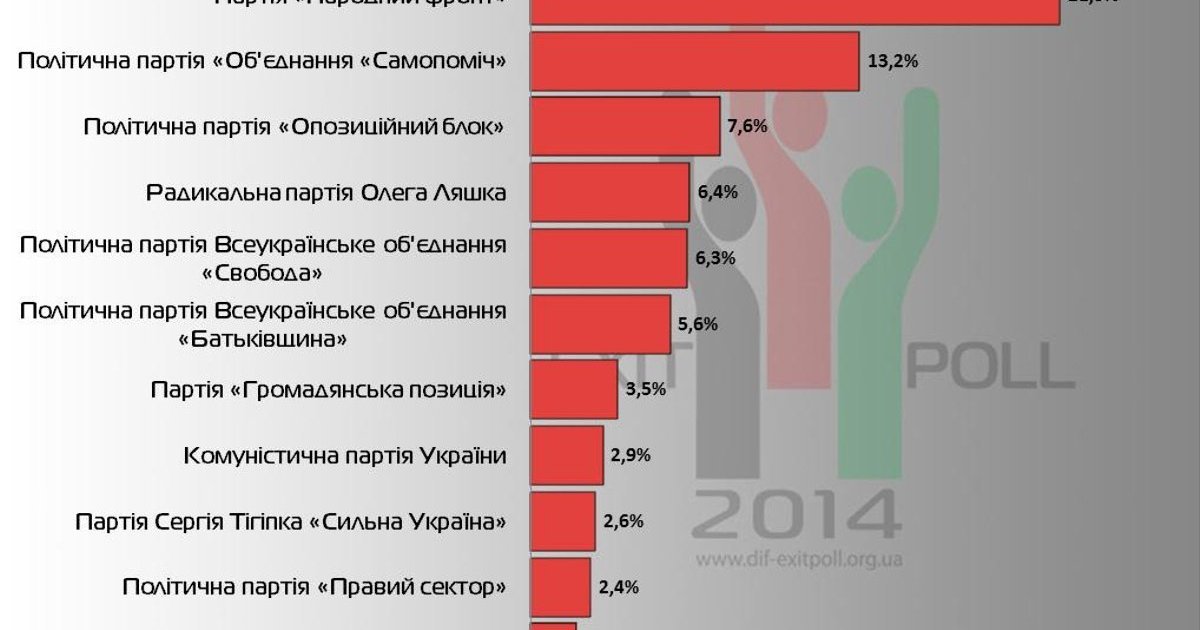 Так, за "Блок Петра Порошенко" отдали свои голоса 23% опрошенных избирателей; за "Народный фронт" - 21,3%; за Объединение "Самопомощь" 13,2%, за "Оппозиционный блок" - 7,6%; за "Радикальную партию", - 6,4%; за "Свободу" - 6,3%, и за "Батьківщину" - 5,6%.