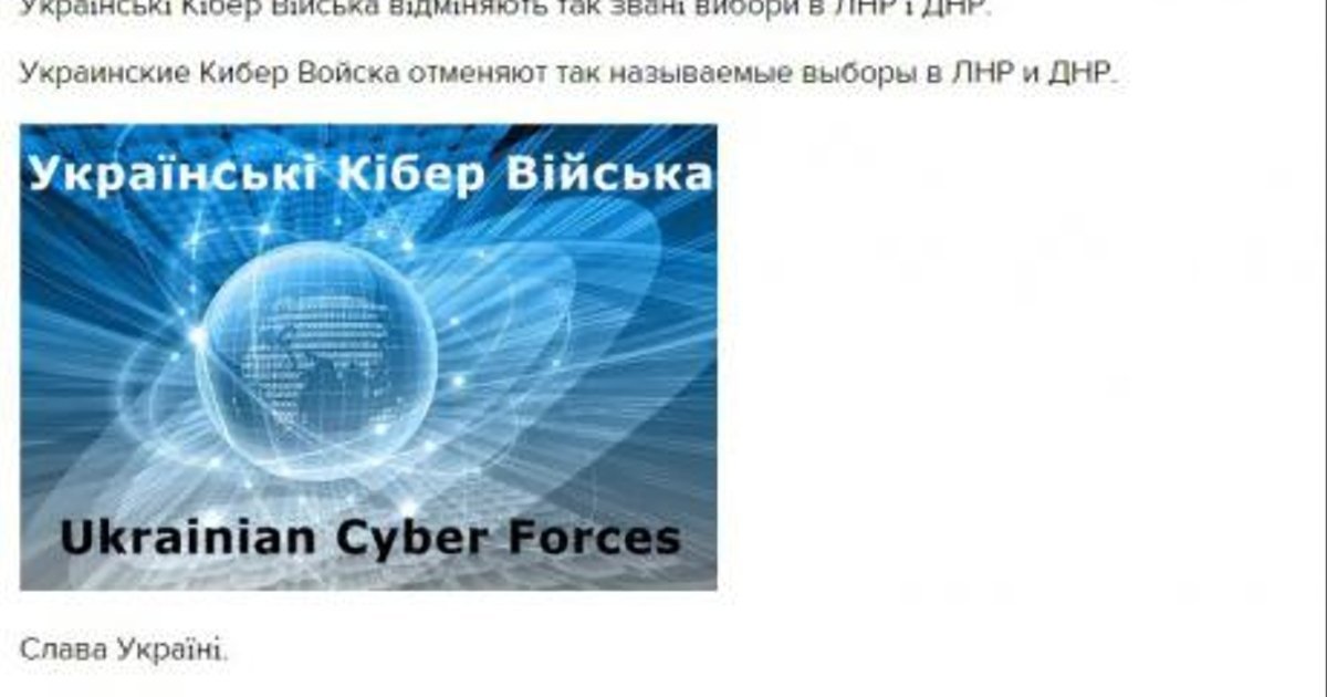 "Украинские кибервойска отменяют так называемые выборы в "ЛНР" и "ДНР", - говорится в сообщении от, очевидно, украинских хакеров сообщает Цензор.НЕТ.