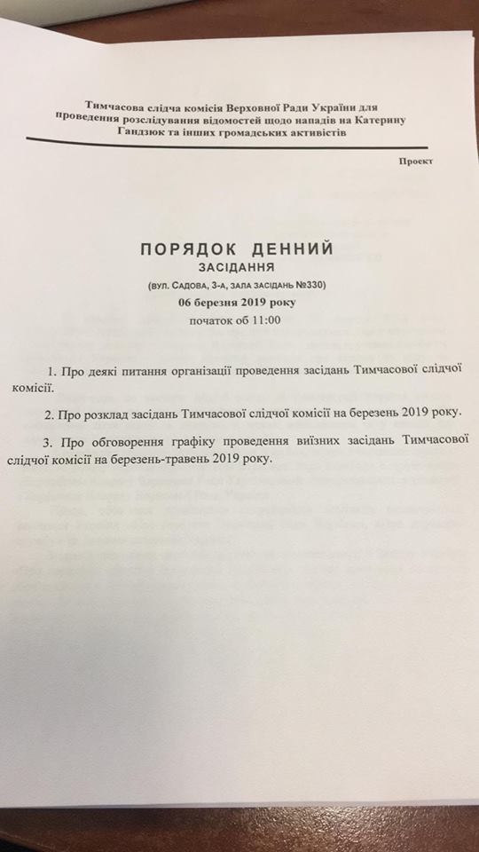 Временная следственная комиссия (ВСК) Верховной Рады для проведения расследования сведений относительно нападений на Екатерину Гандзюк и других общественных активистов намерена провести заседание 6 марта.