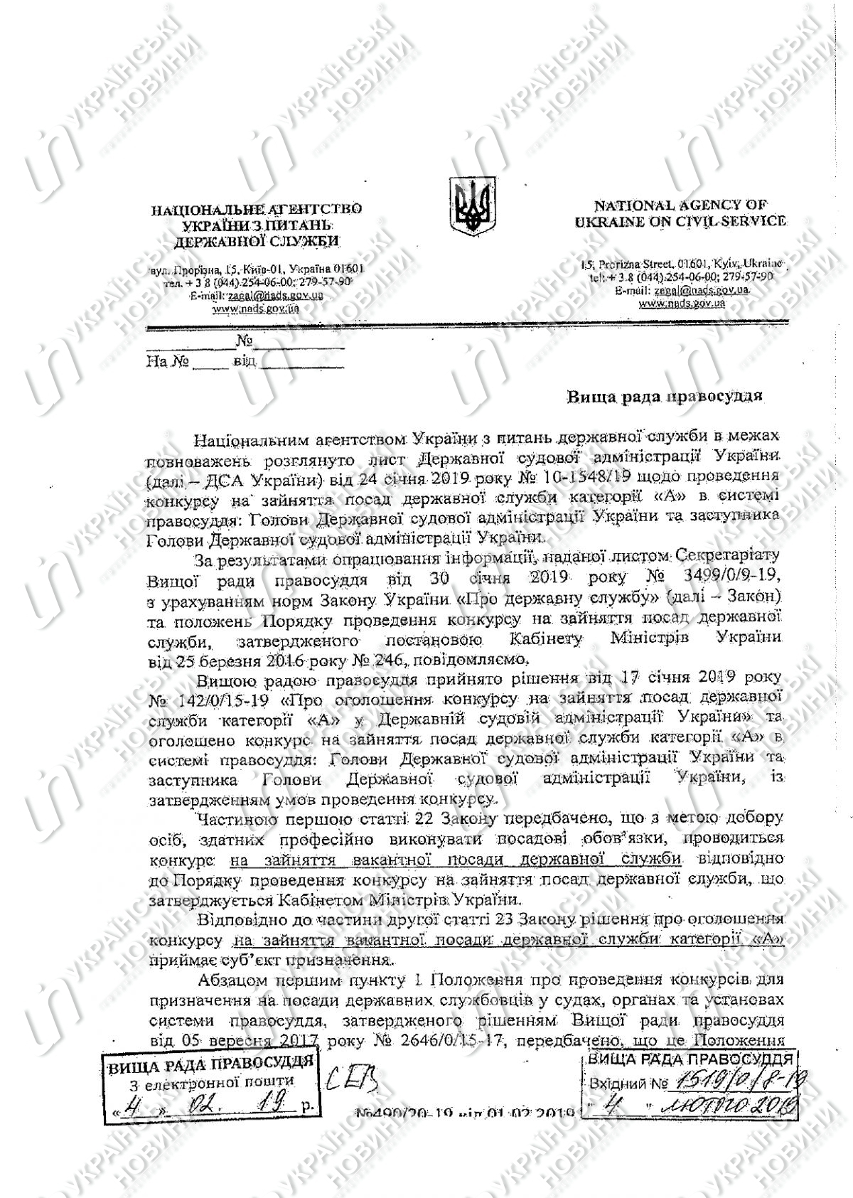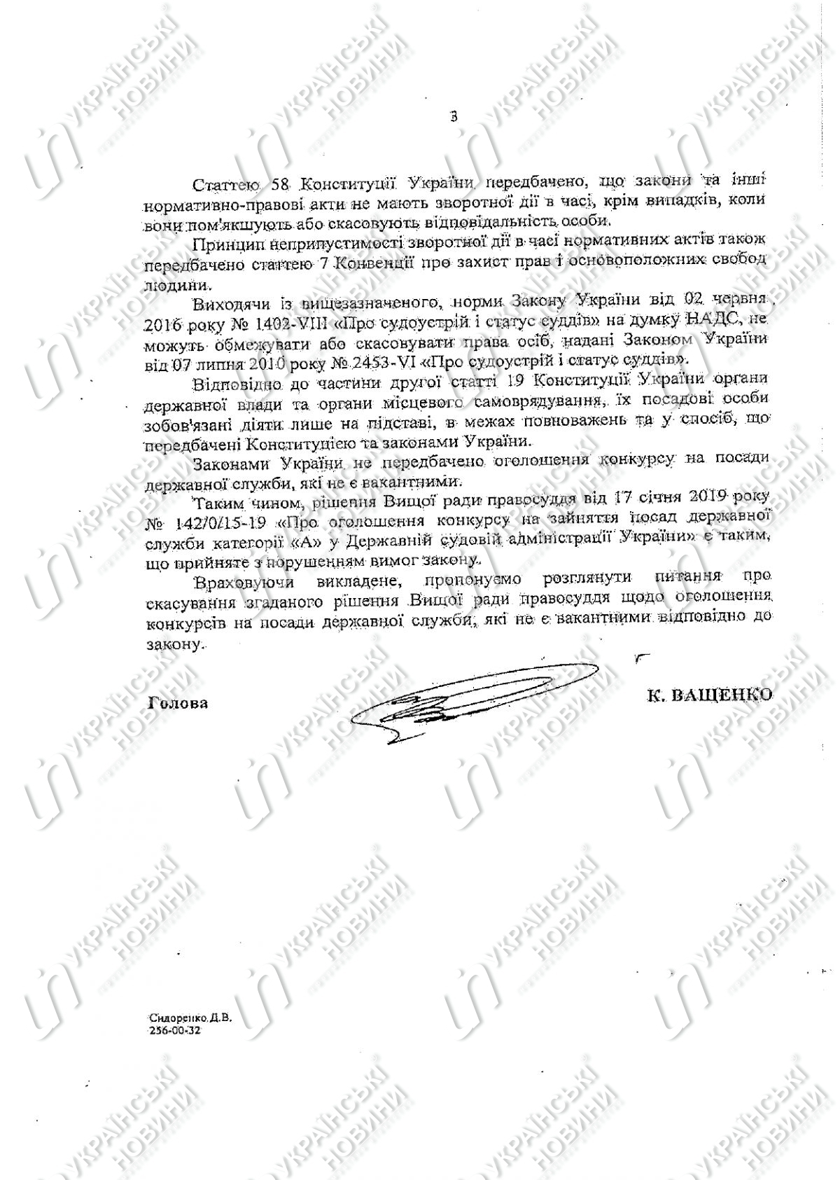 "Ситуация в следующем: 17 января 2019 Высший Совет Правосудия впервые в истории Украины, вопреки Закону Украины "О государственной службе Украины", объявил конкурс на должность председателя ГСА и его заместителя в должности, которые, по состоянию на то время и по сегодняшний день, законно занимают действующие председатель ГСА Украины и его заместитель Людмила Гизатулина", - объясняет Холоднюк.