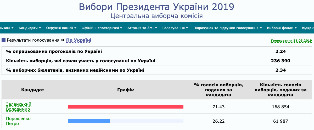 На данный момент обработаны 2,24% протоколов. Зеленский набирает 71,43%, Порошенко – 26,22% голосов.