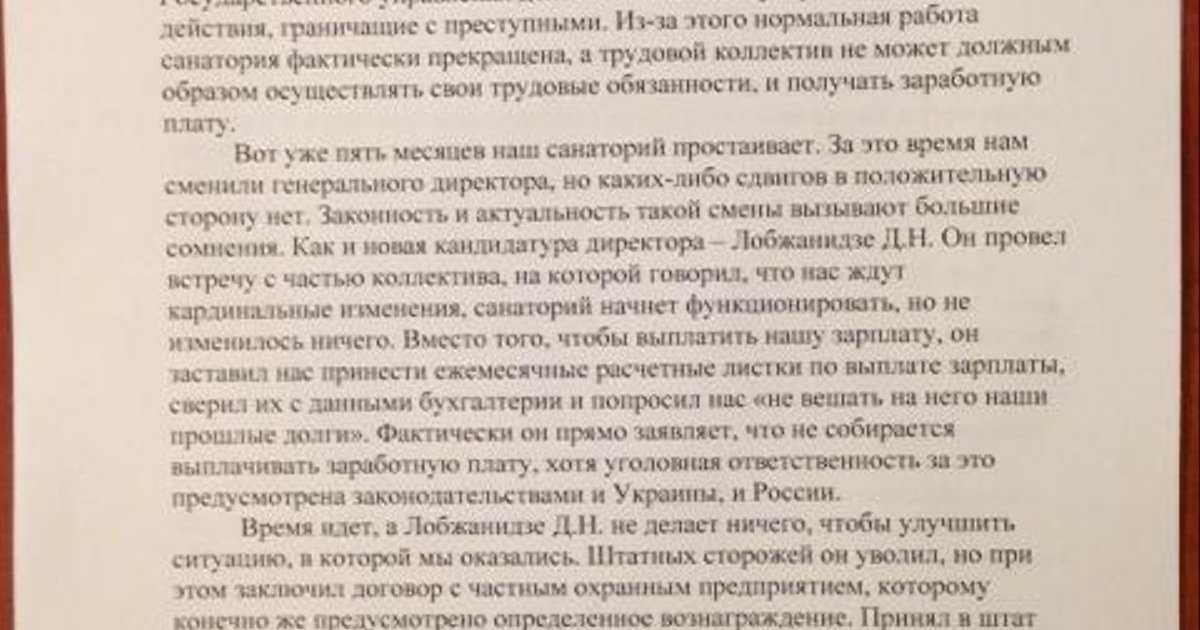 Работники уверены - здравницы разоряют специально. Это результат деятельности нового Руководителя Государственного управления делами - ДУСи - Сергей Березенко. Ведь именно после его назначения дела у них пошли совсем плохо. Зачем новому руководителю уничтожать украинские здравницы в лучших курортных городах России, работники тоже могут объяснить - Сергей Березенко вместе с товарищами решили разорить предприятия, чтобы потом купить за копейки. Для этого назначили и "своих" руководителей в этих здравницах, которые уже уволили квалифицированных юристов и менеджеров, чтобы они не мешали их плану.