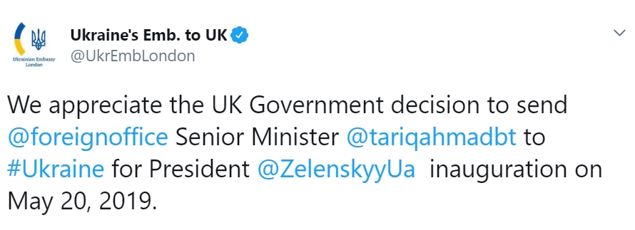 "Мы благодарны за решение правительства Соединенного Королевства отправить высокопоставленного министра Тарика Ахмада на инаугурацию президента Зеленского 20 мая", - говорится в сообщении.