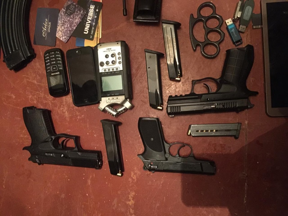 Во время одновременных обысков по адресам фигурантов обнаружена спецодежду, шевроны СБУ, поддельные удостоверения различных правоохранительных органов, оружие, боеприпасы к нему, ножи, маскировочная одежда, балаклавы, рации и множество государственных номерных знаков, которые использовали во время разбойных нападений, а также наркотические средства и вещи, принадлежащие потерпевшим.