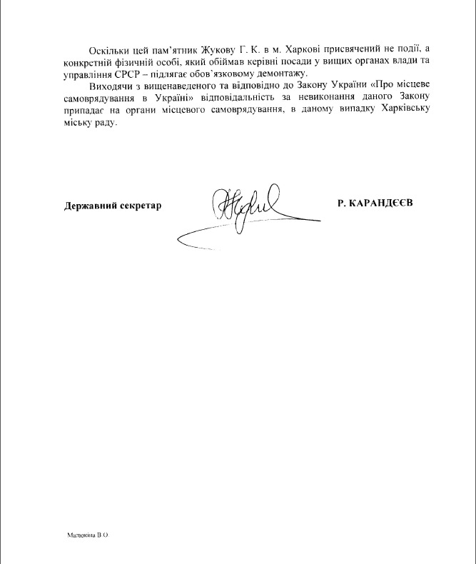 Также харьковчанка Марина Суркова, глава ОО "Общественно-правовая защита" решила обратиться в Министерство культуры за разъяснениями о том, подпадает ли памятник Жукову на проспекте Григоренко под действие Закона о декоммунизации. 10 июня она получила ответ из Киева.