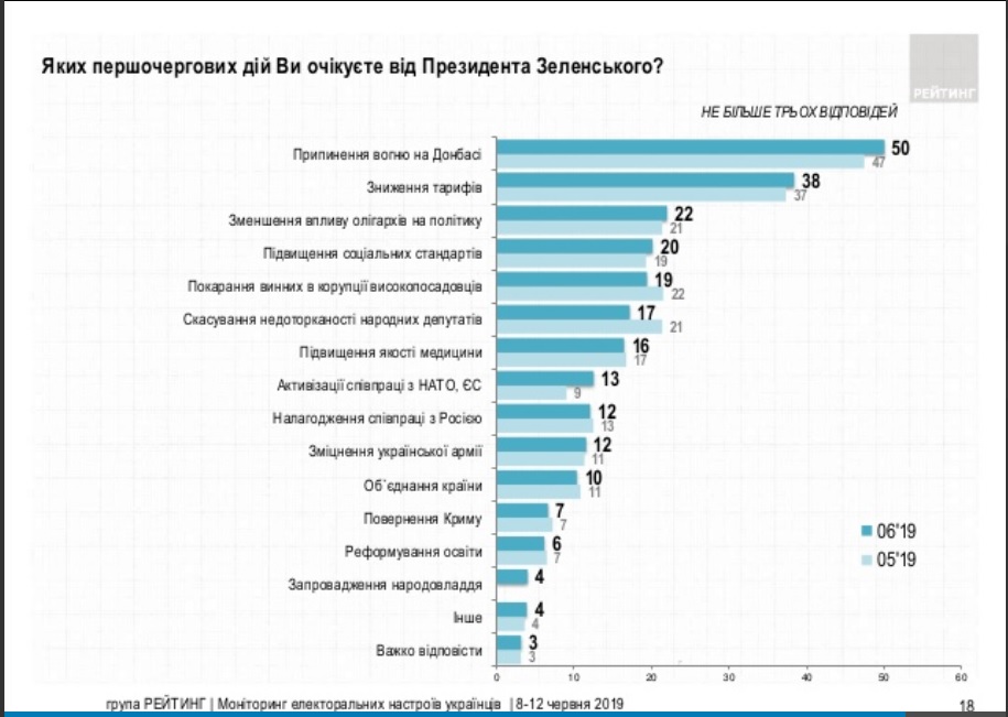 Кроме того отмечается, что половина опрошенных ожидают от Президента В.Зеленского решения вопроса прекращения огня на Донбассе. 38% - имеют надежду относительно снижения тарифов, 22% - ожидают уменьшения влияния олигархов на политику, 20% - ждут повышения социальных стандартов, 19% - наказания виновных в коррупции чиновников, 17% - отмены неприкосновенности народных депутатов, 16% - повышения качества медицины, 13% - активизации сотрудничества с НАТО и ЕС, 12% - налаживания сотрудничества с Россией, 12% - укрепления украинской армии, 10% - объединение страны.