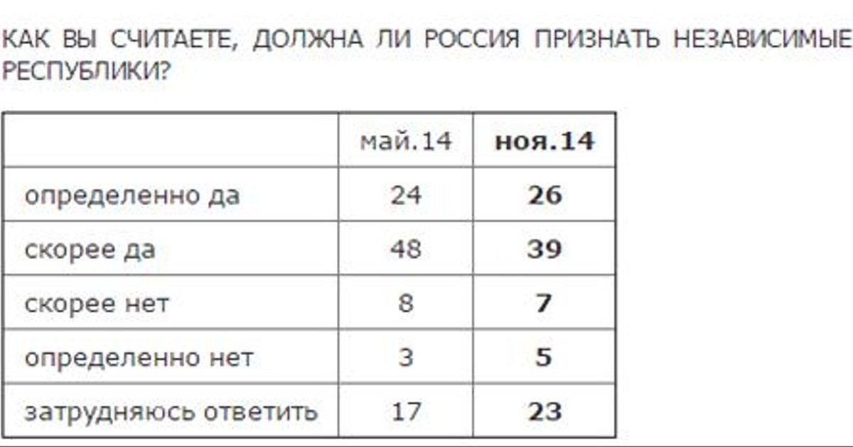 Таковы результаты опроса, проведенного 14 - 17 ноября 2014 года Левадой-Центр, передает Цензор.НЕТ со ссылкой на Украинскую правду.