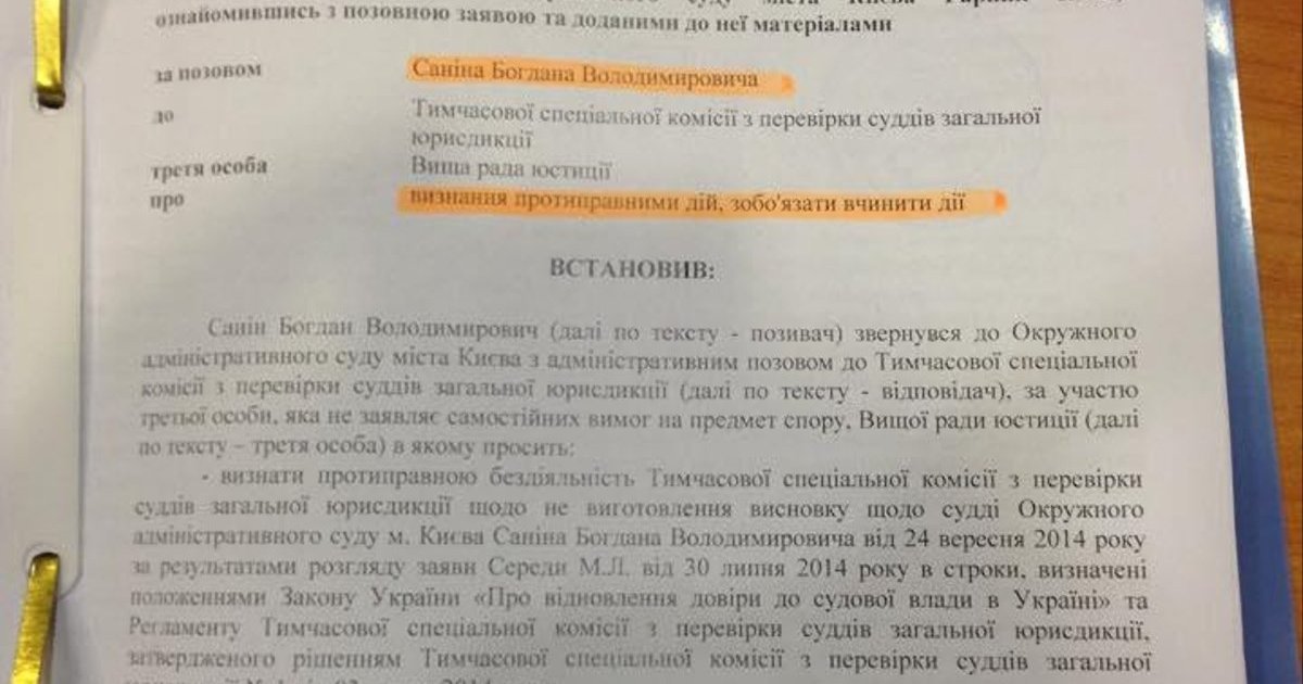 25 сентября Временная специальная комиссия по проверке судей судов общей юрисдикции приняла заключение о нарушении присяги в действиях судьи окружного админсуда города Киева судьи Санина. Теперь через суд судья пытается получить вывод ВСК.