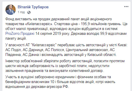 Об этом сообщил и.о. главы Фонда государственного имущества Виталий Трубаров на своей странице в Facebook, передает Цензор.НЕТ.