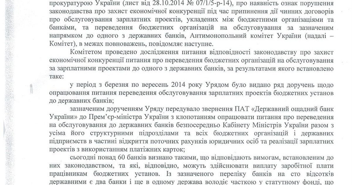 По результатам расследования Антимонопольного комитета, принятые Кабинетом министров Украины протокольные решения о переводе госпредприятий и их сотрудников на обслуживание из коммерческих в государственные банки были приняты не в силу объективных причин, а на основе ходатайства руководства "Ощадбанка".